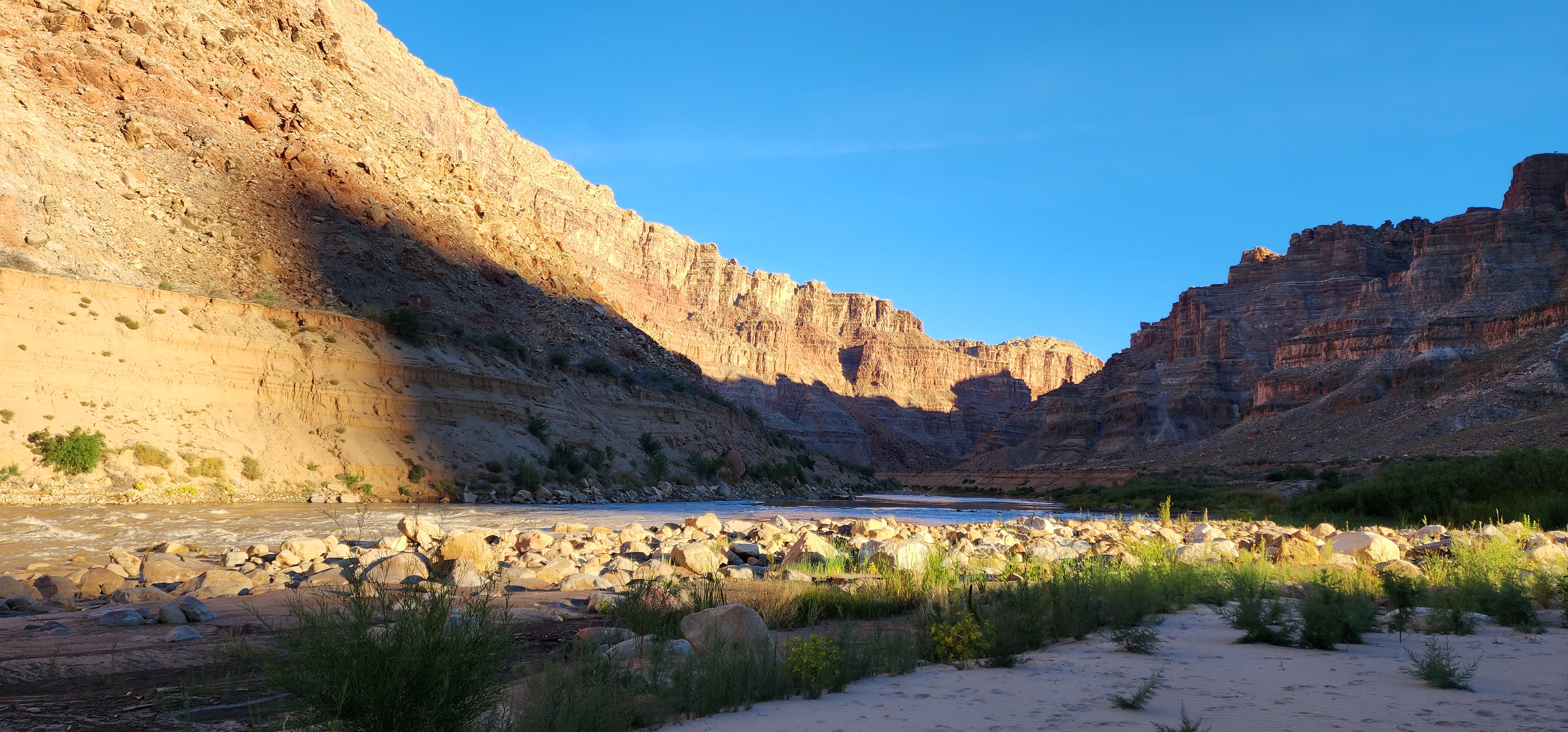Gypsum Rapid (a returned rapid), and Lake Powell sediments, Cataract Canyon, Utah, USA.